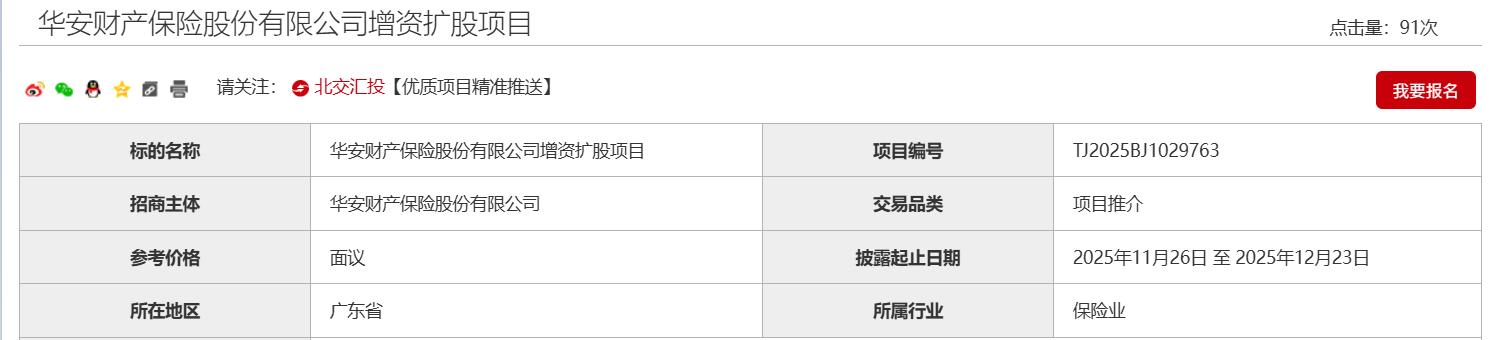 11月25日,北京产权交易所发布的公告显示,华安财险拟进行增资扩股,拟募集资金不低于10亿元,增资后增加注册资本,高于注册资本金部分的股权认购款计入资本公积,由新老股东按持股比例享有。