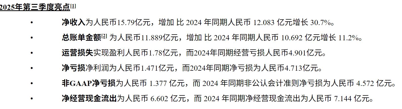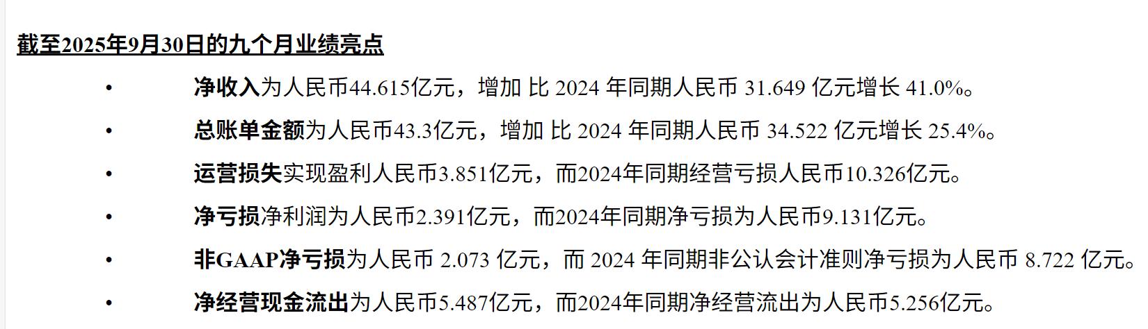 报告显示,2025年前三季度,高途实现营收44.62亿元,同比增长41%;现金收入为43.3亿元,同比增长25.4%;营业亏损为3.85亿元,上年同期为10.33亿元;净亏损为2.39亿元;经调整净亏损为2亿元;经营活动产生的净现金流出为5.49亿元。