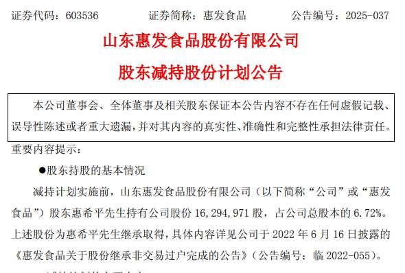 惠发食品披露减持计划,实控人之一惠希平拟减持727万股