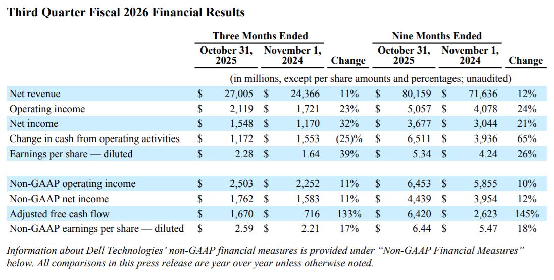 近日,戴尔科技集团公布2026财年第三财季业绩报告。报告显示,戴尔总营收达到270亿美元,同比增长11%;与此同时,戴尔正式任命David Kennedy为新任首席财务官,并上调了全年业绩指引。