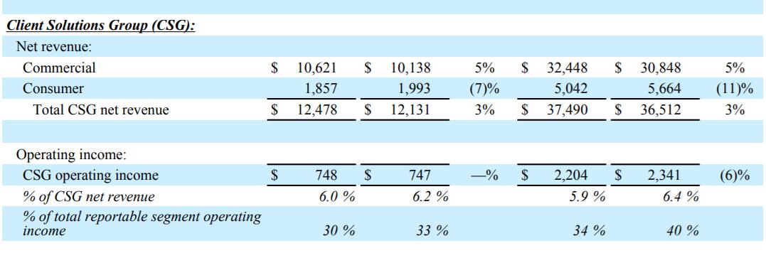 然而,在这份亮眼的成绩单背后,客户端解决方案集团(CSG)中的消费业务营收却出现7%的同比下降,仅为19亿美元,与整体业绩增长形成鲜明对比。
