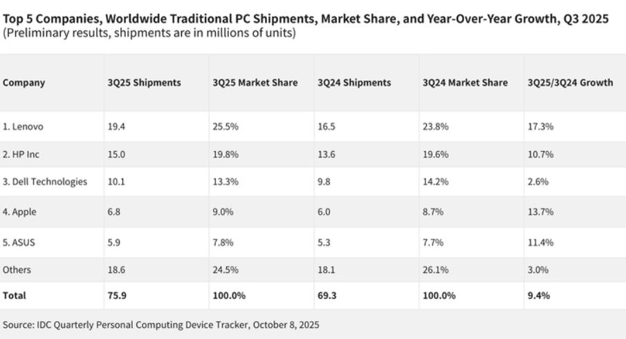 从全球PC市场格局来看,根据IDC发布的2025年第三季度数据,全球传统个人电脑出货量同比增长9.4%,总量达到7590万台。然而,戴尔在该季度的出货量仅增长2.6%,低于市场平均增速水平,导致其市场份额从去年同期的14.2%下降到13.3%。与此同时,联想集团以25.5%的市场份额蝉联全球PC市场第一,并与排名第二的惠普拉开了5.7个百分点的差距。这使得戴尔在消费市场的竞争压力进一步加大。