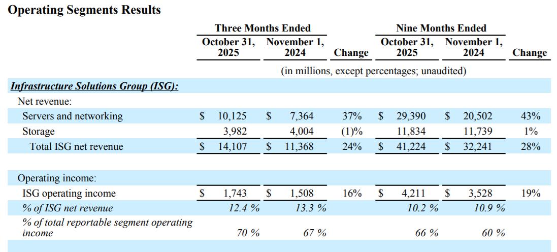 回到集团层面,面对消费业务的疲软,戴尔正将更多资源投向增长更为迅猛的AI服务器领域。在2026财年第三财季,戴尔的基础设施解决方案集团(ISG)营收达141亿美元,同比增长24%,其中服务器和网络业务营收增长37%至101亿美元。