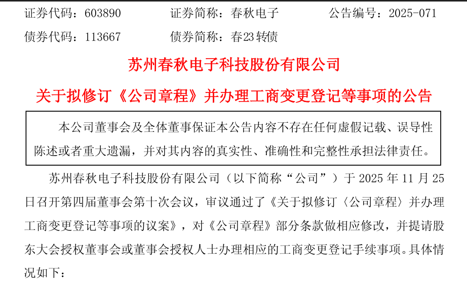 11月26日,苏州春秋电子科技股份有限公司(以下简称“春秋电子”)发布公告称,第四届董事会第十次会议审议通过了《关于拟修订〈公司章程〉并办理工商变更登记等事项的议案》,拟对公司章程进行重要修订。