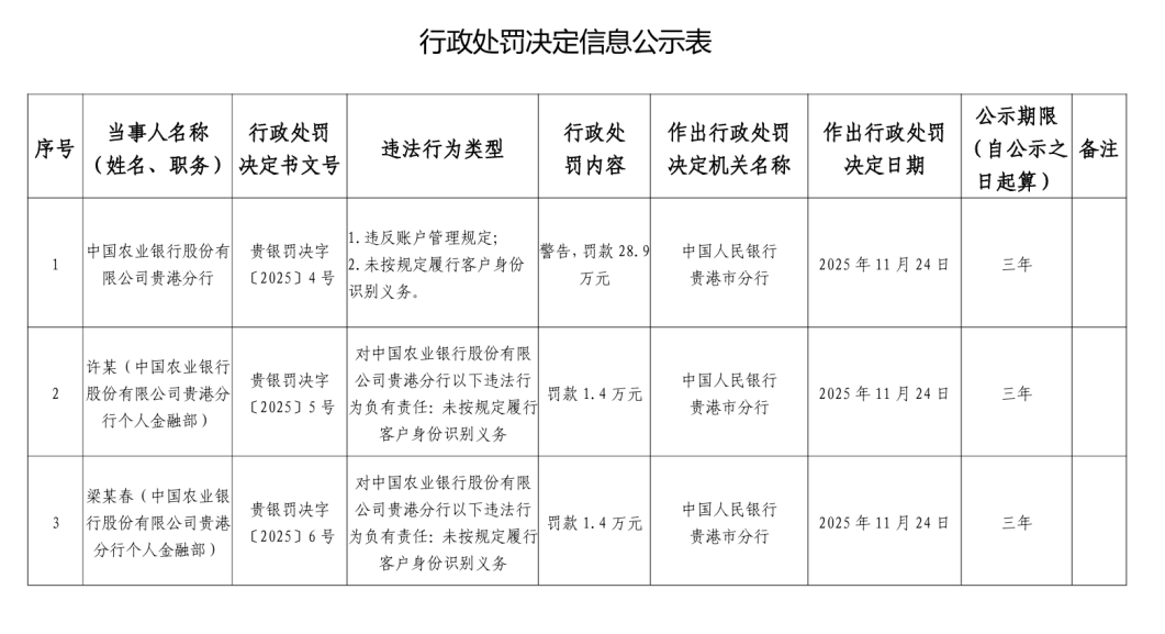 11月27日,中国人民银行贵港市分行发布的行政处罚决定信息公示表显示,中国农业银行股份有限公司贵港分行(以下简称“农行贵港分行”)因两项违法违规行为被监管处罚:一是违反账户管理规定,二是未按规定履行客户身份识别义务。据此,监管部门对该行给予警告并处以28.9万元罚款;该行个人金融部员工许某、梁某春因对“未按规定履行客户身份识别义务”负有直接责任,分别被处以1.4万元罚款。