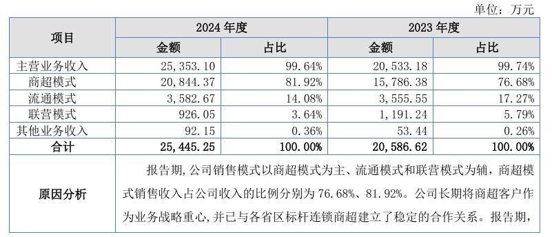 目前天地股份较为依赖商超渠道。据公开转让说明书显示,其已稳定合作大中型连锁商超300多家,商超门店超2000 家,包括家家悦、家得福等。2023年-2024年,天地股份分别实现营业收入2.06亿元、2.54亿元,来自商超渠道的收入分别为1.58亿元、2.08亿元,商超渠道对营收的贡献率分别达到了76.68%、81.92%。