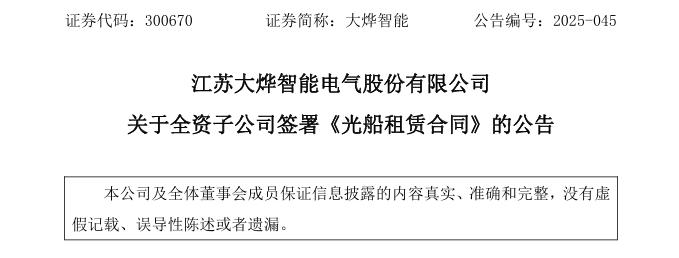 大烨智能出租两艘船舶 将更多的精力投入智能配电及新能源业务