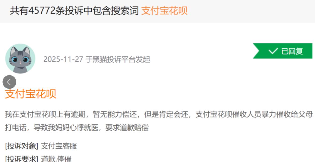 然而,在为广大用户带来便利的同时,花呗也暗藏不少隐忧,进一步加剧了用户端的信任危机。在黑猫投诉平台上,关于支付宝花呗的相关搜索词超4万条,暴力催收已成为投诉重灾区。