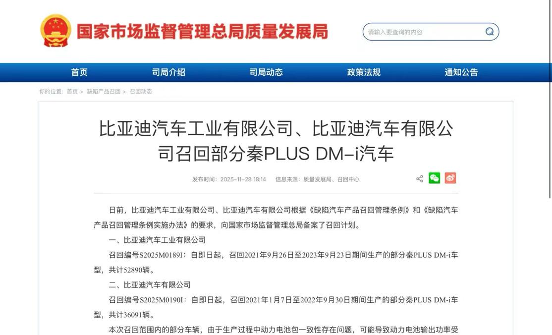具体召回情况如下:比亚迪汽车工业有限公司召回编号为S2025M0189I,自即日起,召回2021年9月26日至2023年9月23日期间生产的部分秦PLUS DM-i车型,共计52890辆;比亚迪汽车有限公司召回编号为S2025M0190I,同样自即日起,召回2021年1月7日至2022年9月30日期间生产的部分秦PLUS DM-i车型,共计36091辆。