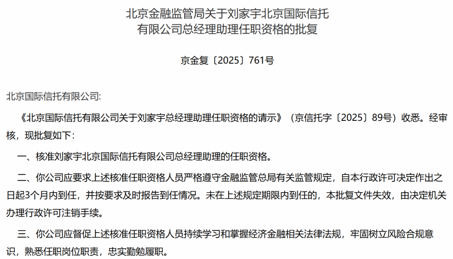 近日,北京金融监督管理局发布《关于刘家宇北京国际信托有限公司总经理助理任职资格的批复》,核准刘家宇担任北京国际信托有限公司(以下简称 “北京国际信托”)总经理助理的任职资格,要求其自行政许可决定作出之日起3个月内到任,未按期到任则该批复文件失效,由监管部门办理行政许可注销手续。