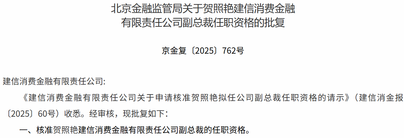 11月28日,北京金融监管局发布关于贺照艳建信消费金融有限责任公司(以下简称“建信消金”)副总裁任职资格的批复,核准贺照艳建信消金副总裁的任职资格。与此同时,北京金融监管局还发布了关于窦振建信消金董事任职资格的批复。