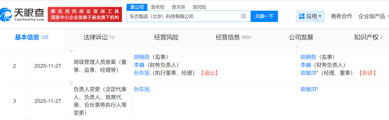 12月1日,天眼查信息显示,东方甄选(北京)科技有限公司近日发生工商变更,原法定代表人、执行董事、经理孙东旭卸任相关职务,由新东方创始人俞敏洪接任法定代表人、经理,并担任董事一职。