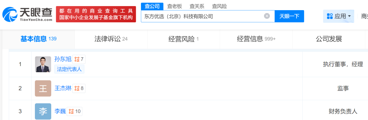 值得关注的是,孙东旭目前仍担任东方甄选母公司东方优选(北京)科技有限公司的法定代表人、执行董事及经理职务,母公司经营范围暂未发生调整。