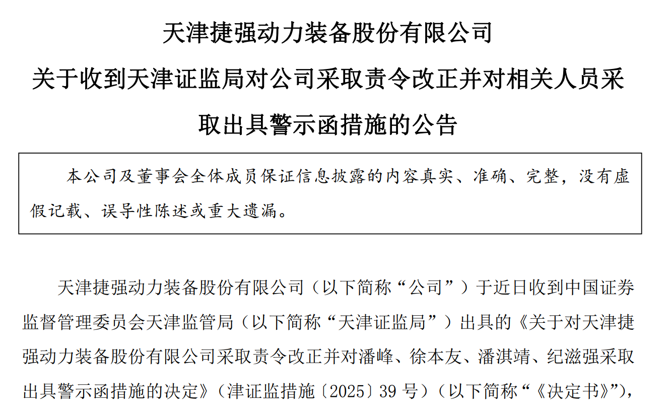 11月19日,天津捷强动力装备股份有限公司(以下简称“捷强装备”)发布公告称,收到中国证券监督管理委员会天津监管局(以下简称“天津证监局”)出具的《关于对天津捷强动力装备股份有限公司采取责令改正并对潘峰、徐本友、潘淇靖、纪滋强采取出具警示函措施的决定》。