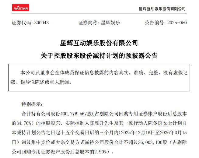 减持前,陈雁升及其一致行动人陈冬琼合计持有星辉娱乐股份430,776,567股(占剔除公司回购专用证券账户股份后总股本的34.70%)。