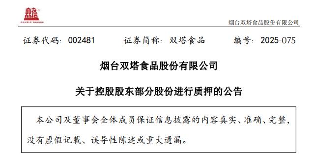 日前,烟台双塔食品股份有限公司(002481.SZ,以下简称“双塔食品)发布公告称,控股股东招远君兴农业发展中心于11月26日将持有的721万股股份进行质押,质权人为潍坊银行股份有限公司烟台招远支行,质押用途为担保,质押到期日为2028年11月24日。