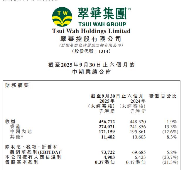 这一盈利下滑并非孤立事件。在截至2025年3月31日的完整财年中,翠华控股已经历了净利润的大幅下跌,归母净利润同比下跌68.42%至1234.2万港元。更早些时候,翠华控股还曾发布盈警,预计2025财年净利润将下降50%-70%。