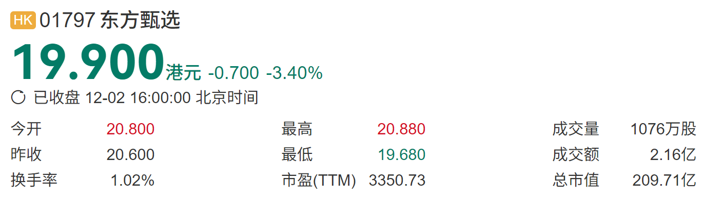 12月1日,东方甄选股价走强,一度涨逾9%,但市场信心并未持续;12月2日,其股价回落,收盘价报19.9港元/股,总市值为209.71亿港元。若拉长时间线对比,东方甄选巅峰时期市值曾达742.1亿港元,近3年市值累计蒸发超532亿港元,资本市场对其战略稳定性与盈利能力的担忧可见一斑。