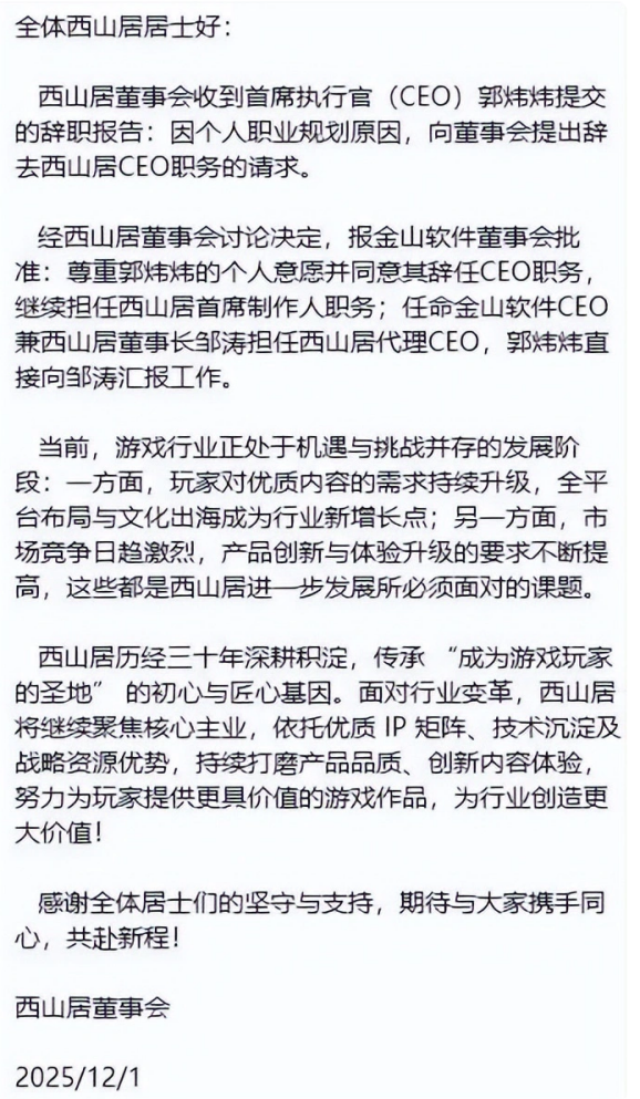 据多家媒体报道,12月1日,金山软件旗下西山居发布内部信称,西山居董事会收到首席执行官(CEO)郭炜炜提交的辞职报告,其因个人职业规划原因,向董事会提出辞去西山居CEO职务的请求。