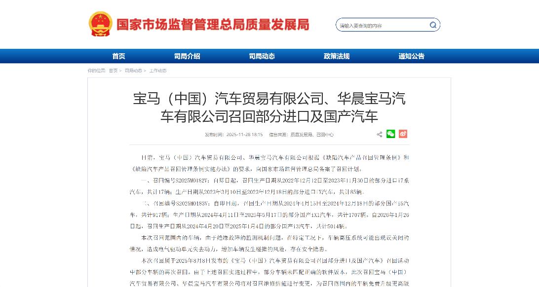 此次召回分为两个编号。召回编号S2025M0182V为:自即日起召回生产日期在2022年12月12日至2023年11月30日的部分进口i7系汽车,共17辆;生产日期在2023年3月10日至2023年12月18日的部分进口iX汽车,共85辆。召回编号S2025M0183V为:自即日起召回生产日期在2024年4月15日至2024年12月18日的部分国产i5汽车,共917辆;生产日期在2024年4月11日至2025年5月17日的部分国产iX1汽车,共1707辆;自2026年1月26日起,召回生产日期在2024年4月20日至2025年1月4日的部分国产i3汽车,共5014辆。