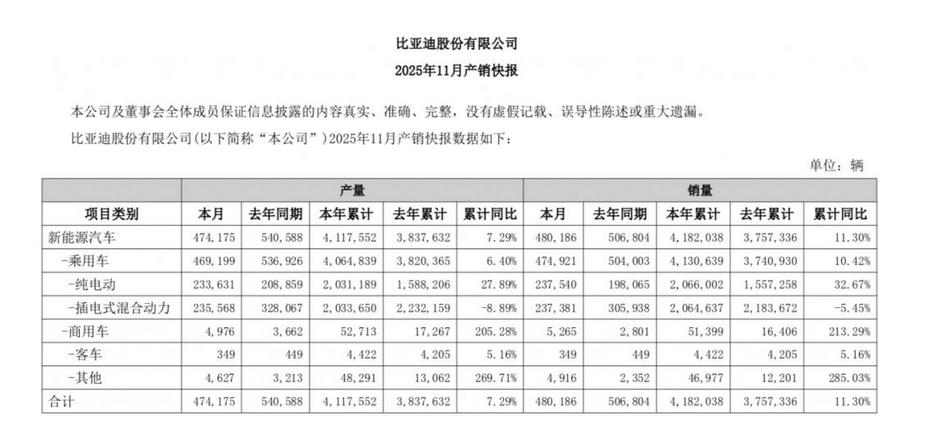 近日,比亚迪公布了2025年11月及1-11月的产销数据。数据显示,11月,比亚迪新能源汽车销量达480186辆,虽较2024年同期下降5.25%,但环比提升,创下今年以来月销量新高,产量为474175辆,生产节奏稳定。