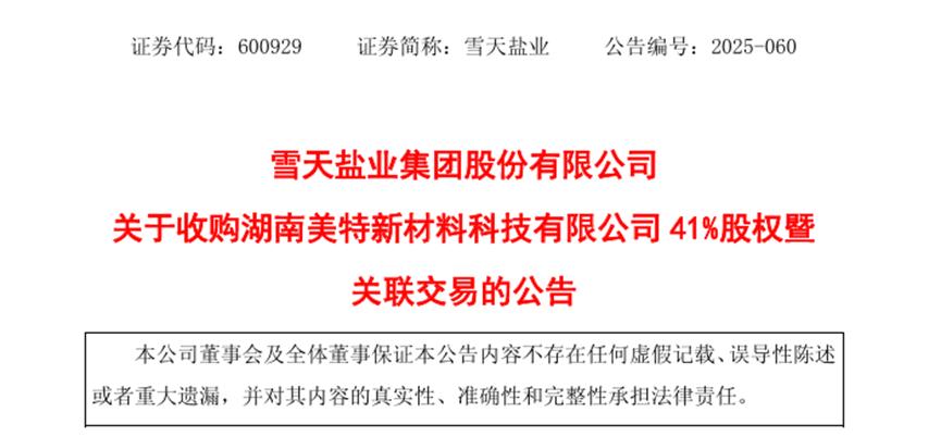 公告显示,本次交易构成关联交易,不构成重大资产重组。此前,雪天盐业已持有美特新材20%股权,本次收购完成后,雪天盐业将合计持有美特新材61%的股份,成为美特新材的控股股东。