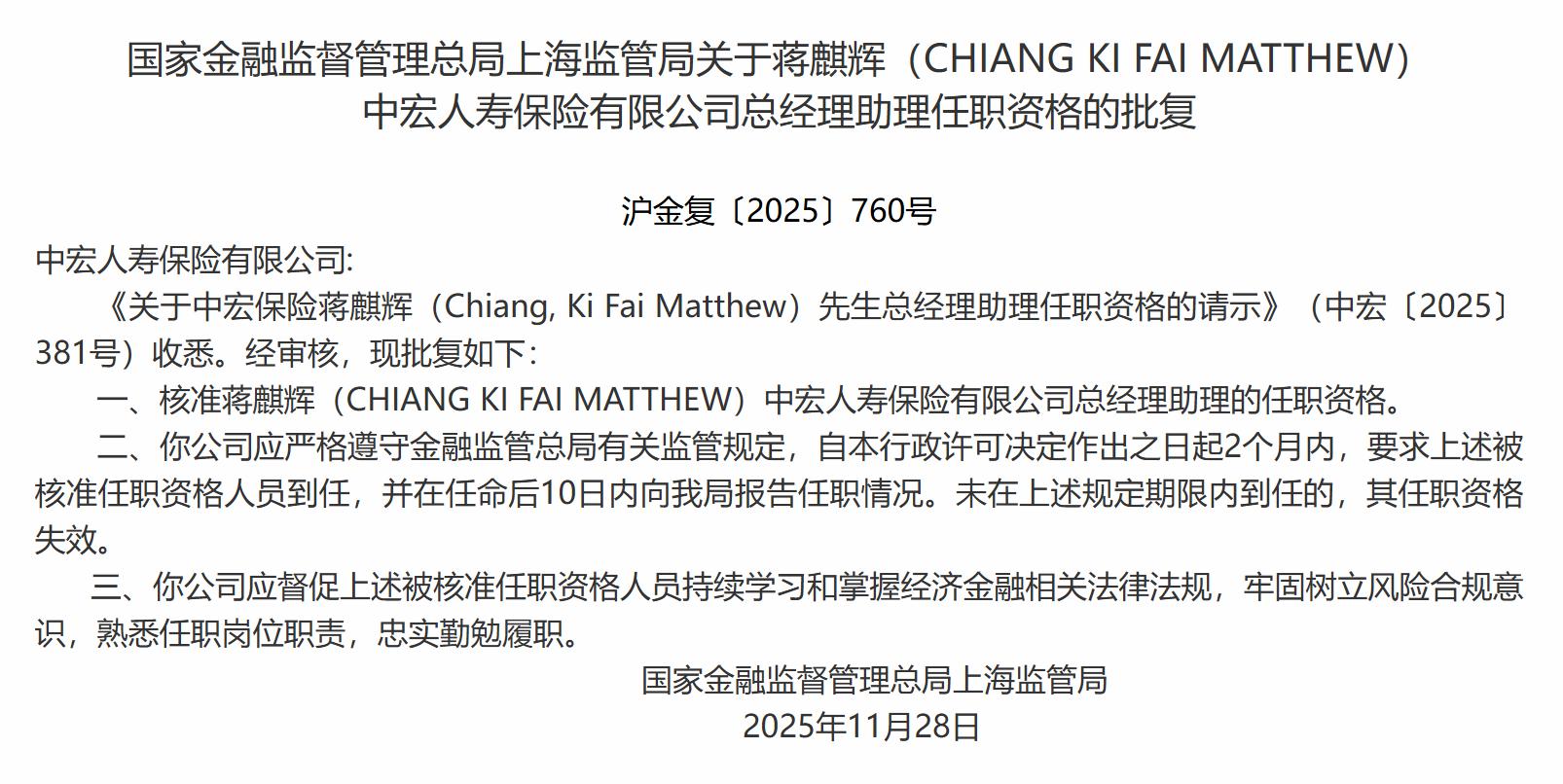 12月3日,国家金融监督管理总局上海监管局正式批复,核准蒋麒辉(CHIANG KI FAI MATTHEW)担任中宏人寿保险有限公司(下称“中宏人寿”)总经理助理的任职资格。