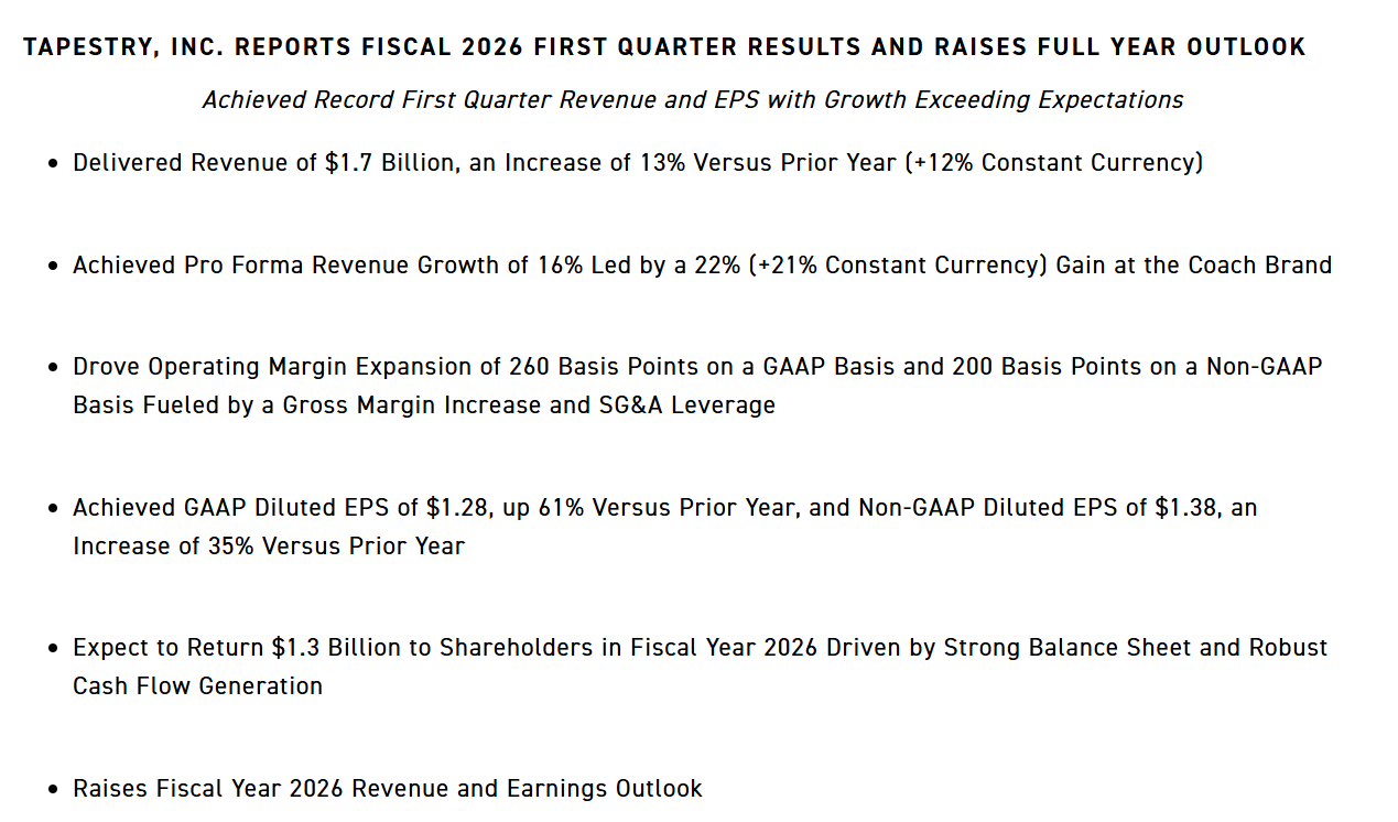 近期,COACH母公司Tapestry发布了2026财年第一季度(截至2025年9月27日)业绩。实现销售额17.05亿美元,同比增长13%;实现营业利润3.28亿美元,同比增长30%。基于2026财年第一季度的业绩表现,Tapestry上调了全年业绩指引。