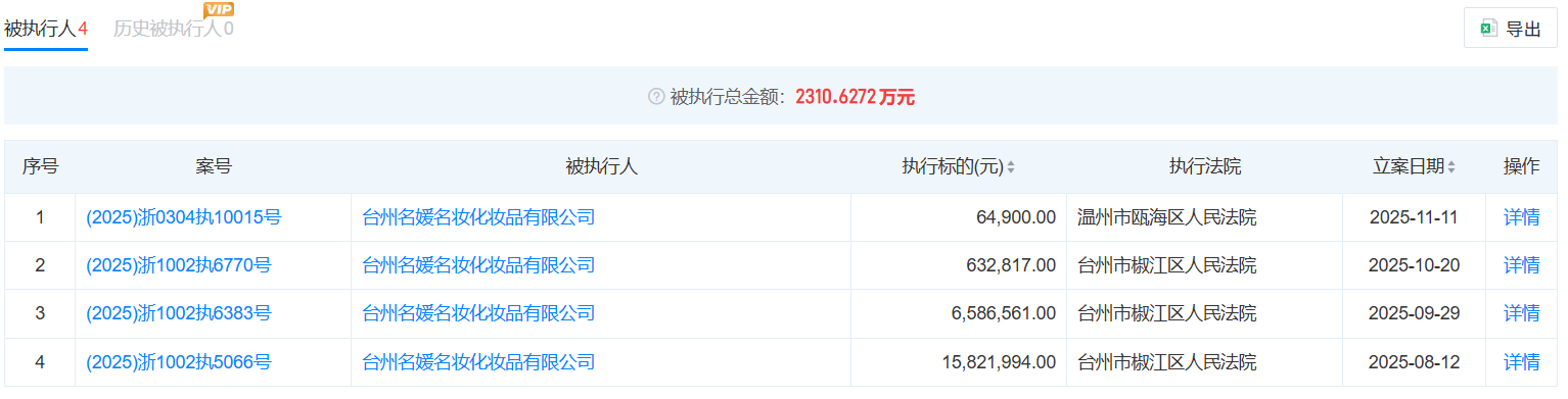 天眼查还显示,今年下半年以来,名媛名妆新增了四条被执行信息,被执行金额合计超过2000万元。