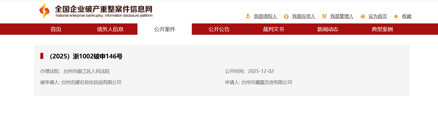 12月2日,全国企业破产重整案件信息网显示,名媛名妆被台州市黛露百货有限公司申请破产审查。