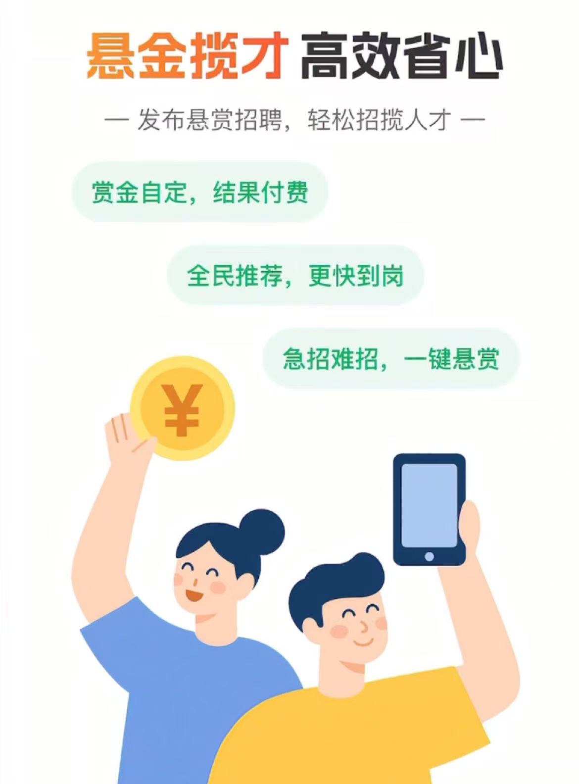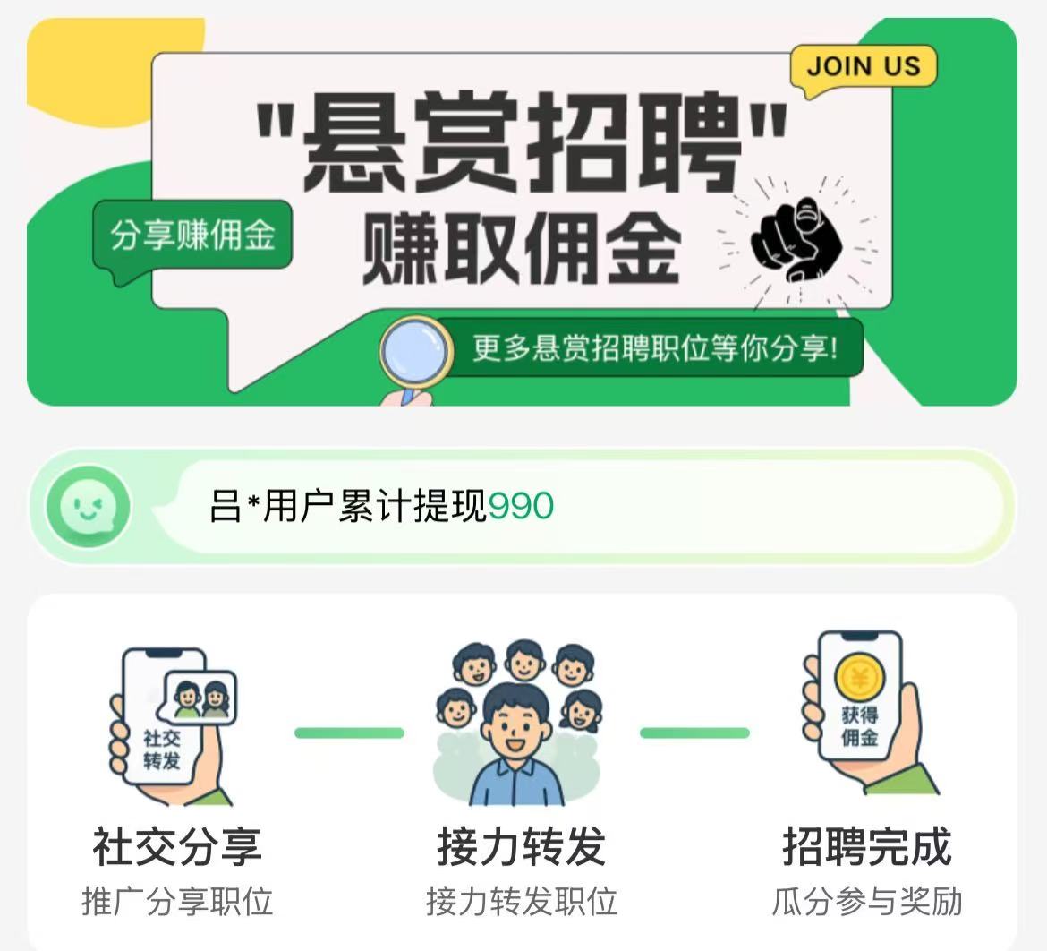 这种“免费招聘+结果付费”的创新模式,让平台收入与企业招聘结果深度绑定,倒逼平台从“流量搬运工”转变为“精准匹配者”。同时,悬赏招聘还构建了“人脉变现”的良性生态,求职者不仅可以免费投递简历,还能通过转发岗位、推荐好友入职瓜分赏金,让求职者从“被动求职”变为“主动参与”。