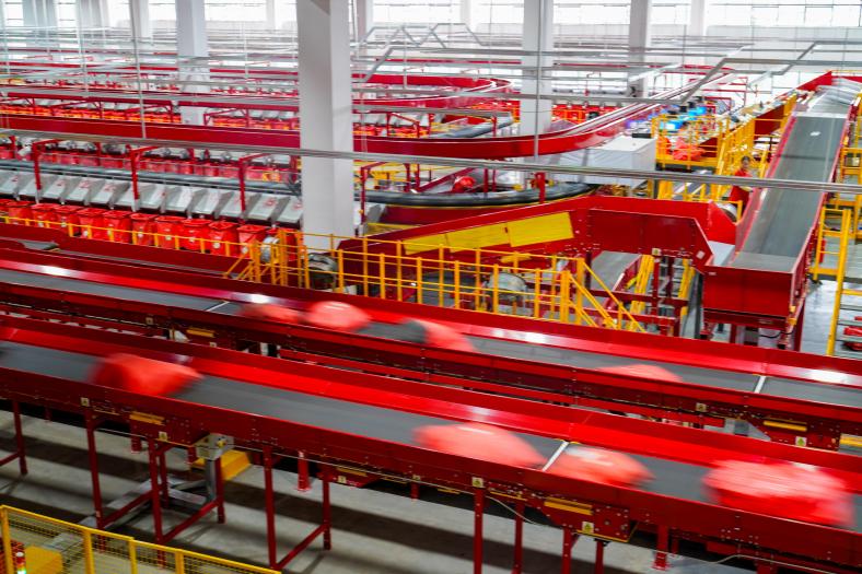 网点操作区内,两条自动化流水线正在高效运转。包裹经过自动扫描称重区,系统即时录入运单信息并完成计费;分拣区的智能光幕可以识别包裹面单上的三段码,将其分拨到对应的配送线路笼车内。