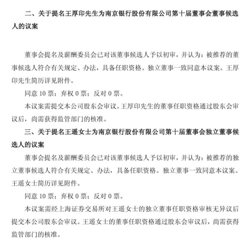 根据会议决议,董事会审议通过了《关于提名王厚印为南京银行股份有限公司第十届董事会董事候选人的议案》。董事会提名及薪酬委员会已对候选人资格予以初审,认为其符合相关法律法规及监管办法规定的任职资格。该议案获得了全体与会董事的同意,表决结果为10票同意、0票弃权、0票反对。独立董事亦对本议案表示一致同意。王厚印的简历已作为附件披露。
