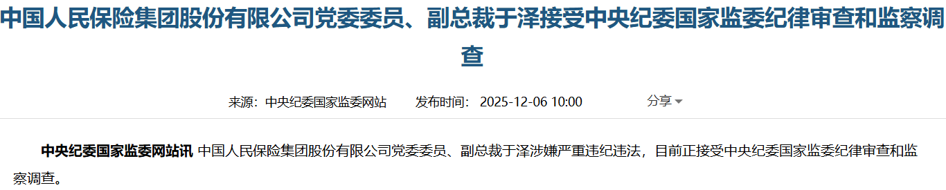 12月6日,据中央纪委国家监委网站消息,中国人民保险集团股份有限公司(以下简称“中国人保”)党委委员、副总裁于泽涉嫌严重违纪违法,目前正接受中央纪委国家监委纪律审查和监察调查。