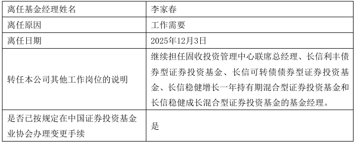 公告指出,李家春离任上述基金以后,继续担任固收投资管理中心联席总经理、长信利丰债券基金、长信可转债债券基金、长信稳健增长一年持有期混合基金和长信稳健成长混合基金的基金经理。