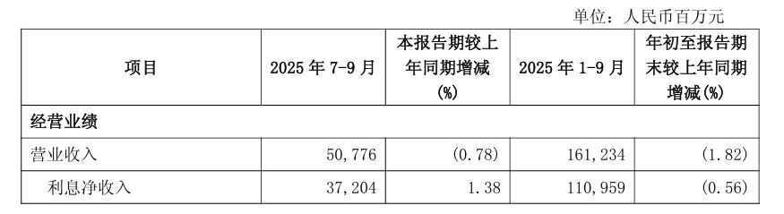 据兴业银行此前披露的2025年三季度报告,前三季度该行实现营业收入1612.34亿元,同比下降1.82%;实现归属于母公司股东的净利润630.83亿元,同比增长0.12%。