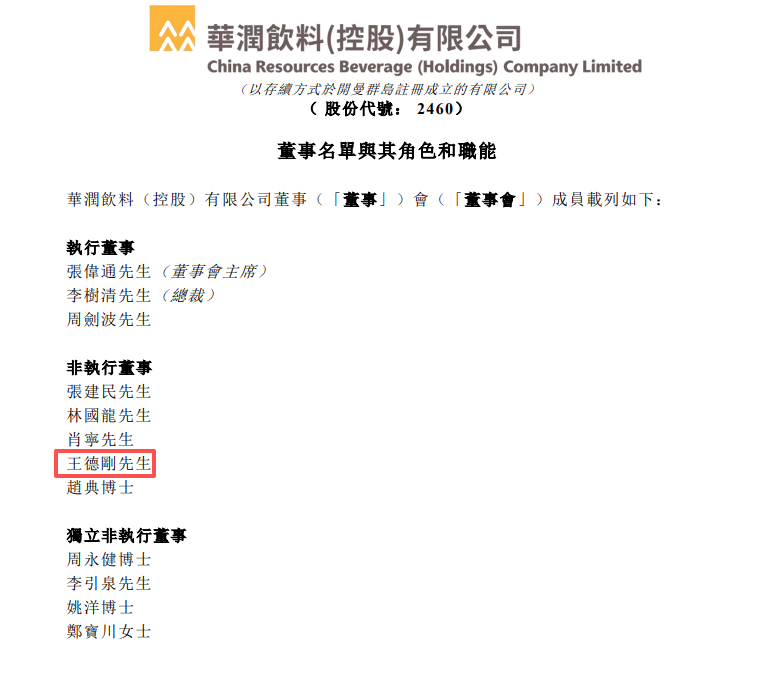 华润饮料董事迎新 前康师傅与今麦郎高管王德刚被任命为非执行董事
