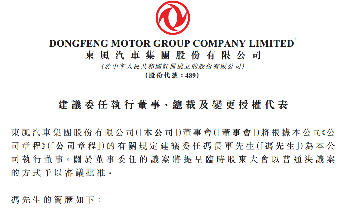 东风集团股份拟委任冯长军为执行董事、总裁