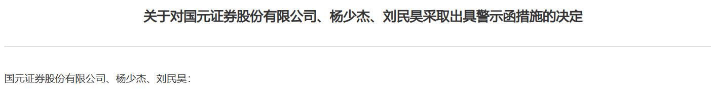 安徽证监局决定对国元证券、杨少杰、刘民昊采取出具警示函的行政监管措施,并记入证券期货市场诚信档案。