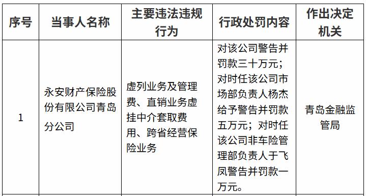 同时,永安财险青岛分公司时任市场部负责人杨杰被给予警告并被罚款5万元;时任非车险管理部负责人于飞凤被警告并被罚款1万元。