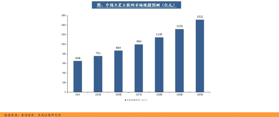 根据泰伯智库发布的《2024 全球及中国卫星互联网全景研究报告》显示,2024 年中国卫星互联网行业市场规模达到 648 亿元,未来,该产业的市场规模将以超过两位数的 CAGR 加速增长;报告预测到2025年市场规模达到 751 亿元,2030年将达到1512亿元。