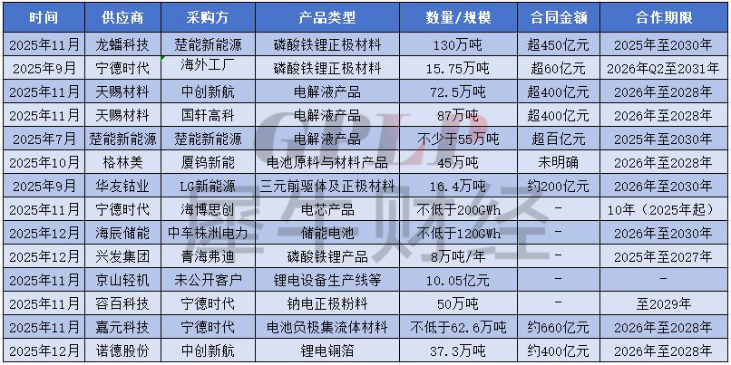 面对下游需求的增长,锂电产业链的竞争焦点已从价格战转向产能争夺战,以长期协议(LTA)“锁量”成为企业在本轮上行周期巩固市场地位的策略之一。公开信息显示,仅在2025年11月,业内就密集出现了多起涉及钠电池、储能电芯、关键材料的巨额锁定协议。