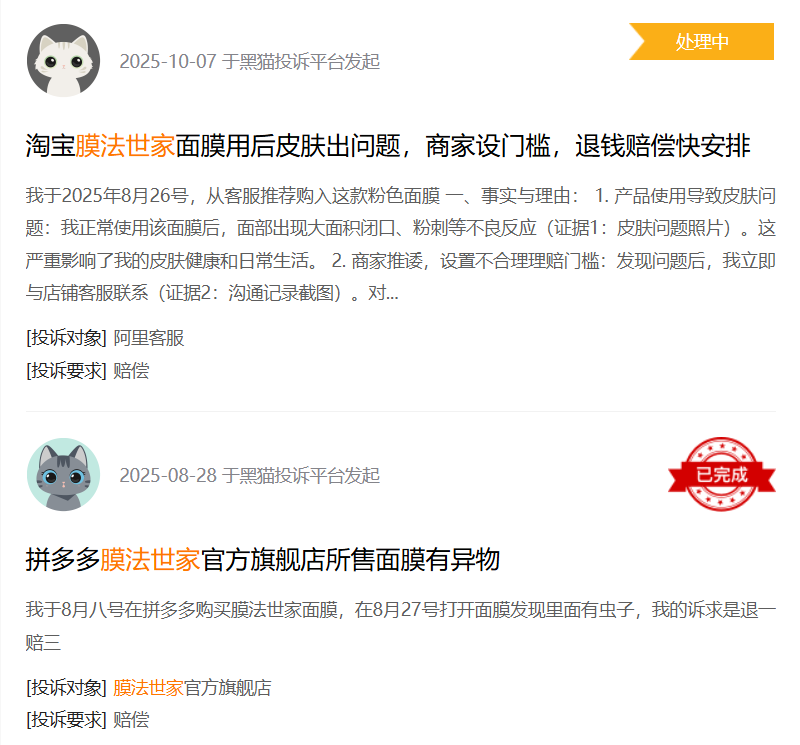 黑猫投诉平台显示,近半年以来,消费者反馈“使用膜法世家面膜后皮肤出现问题”“面膜有异物”“致敏”等。面对这些问题,膜法世家是否应该思考一下,在“卷研发”时是不是也应该更多地关注一下基础使用和安全问题。