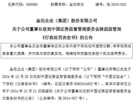12月16日,金花企业(集团)股份有限公司(600080.SH,简称“金花股份”)发布公告称,董事长邢雅江因未及时披露个人被取保候审事项,收到陕西证监局《行政处罚决定书》,被给予警告并处以350万元罚款。