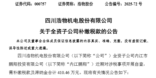 12月17日,四川浩物机电股份有限公司(000757.SZ,以下简称“浩物股份”)发布公告称,全资子公司内江市鹏翔投资有限公司通过涉税事项自查,需补缴税款及滞纳金合计410.46万元。