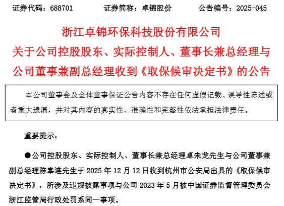 12月15日,浙江卓锦环保科技股份有限公司(688701.SH,以下简称“卓锦股份”)发布公告称,控股股东、实际控制人、董事长兼总经理卓未龙,以及董事兼副总经理陈奉连收到杭州市公安局出具的《取保候审决定书》,二人因涉嫌违规披露、不披露重要信息被取保候审,相关事项与2023年卓锦股份收到的证监会浙江监管局行政处罚系同一案件。