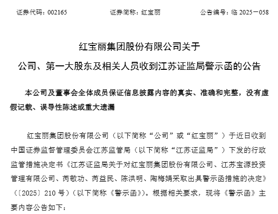 12月12日,红宝丽集团股份有限公司(002165.SZ,以下简称“红宝丽”)发布公告称,红宝丽、控股股东江苏宝源投资管理有限公司及董事长芮敬功等4名高管收到江苏证监局警示函,涉及关联方非经营性资金占用未披露、年报信息披露不准确等违规行为,相关违规情况已被记入证券期货市场诚信档案。同日,深交所对红宝丽及相关当事人同步给予通报批评处分。