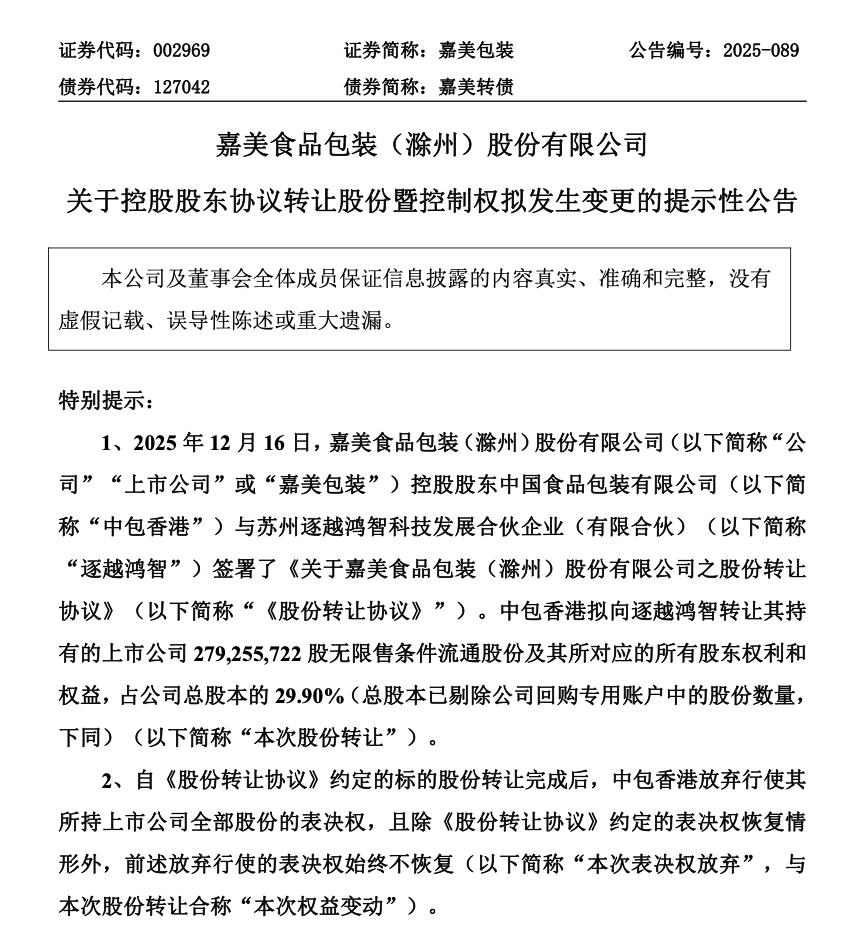 近日,嘉美食品包装(滁州)股份有限公司(以下简称“嘉美包装”)发布公告称,控股股东中国食品包装有限公司(以下简称“中包香港”)与苏州逐越鸿智科技发展合伙企业(以下简称“逐越鸿智”)签署了《股份转让协议》;股东富新投资有限公司(以下简称“富新投资”)、中凯投资发展有限公司(以下简称“中凯投资”)分别与逐越鸿智签署了《预 先接受要约收购的协议》。
