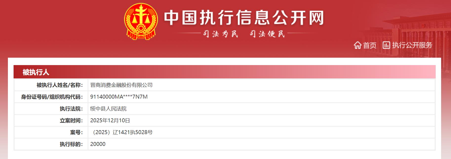 12月15日,中国执行信息公开网发布的信息显示,晋商消费金融股份有限公司(以下简称“晋商消费金融”)成为被执行人,执行法院为辽宁省葫芦岛市绥中县人民法院,立案时间为2025年12月10日,执行标的为20000元。