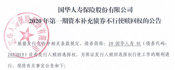 日前,国华人寿发布公告称,本期不行使“20国华人寿01”资本补充债券赎回选择权,发行总额为30亿元,未赎回部分债券利率为6.5%。